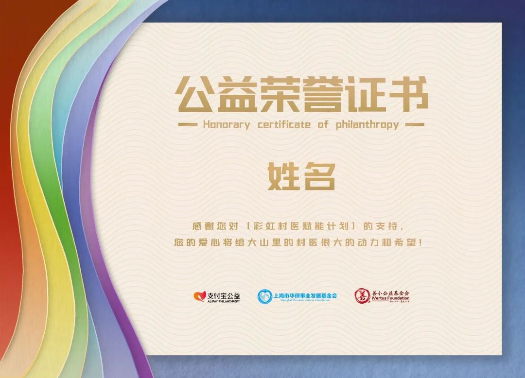 成为【彩虹村医赋能计划】长期爱心商户的可免费申领荣誉证书一份,请提供【姓名(或店铺名称)+电话+邮寄地址+爱心商户入驻信息截屏】发送给客服,定制数量可能较多请耐心等待。善心善行,点亮希望,谨以这份纪念向您表达无尽的感谢!