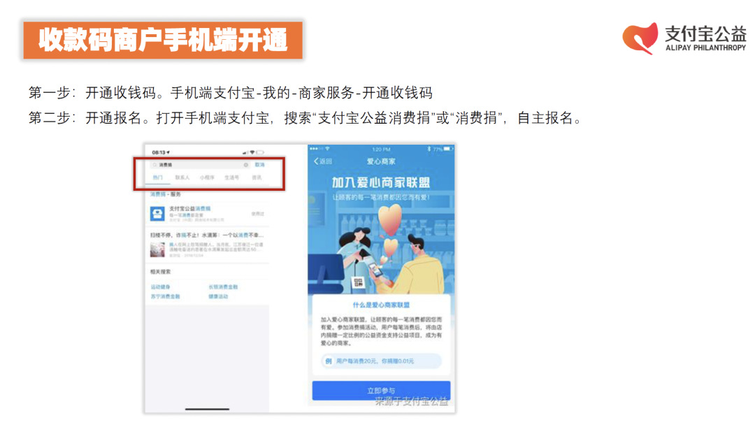 欢迎加入支付宝公益爱心商户,每入账一笔就会留下一份爱心,助力村医守护村民,操作如下: