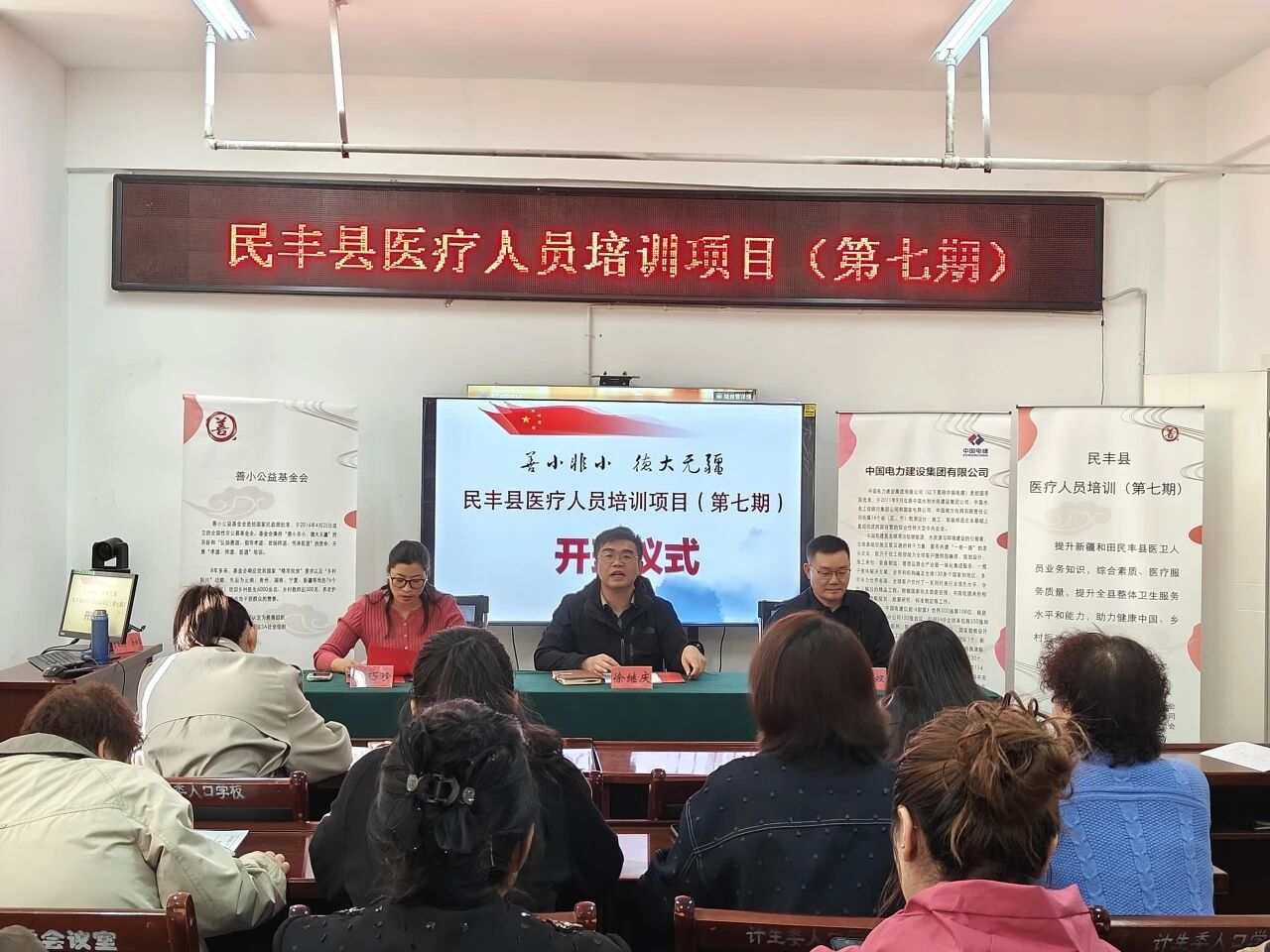 01#10月15日,第七期民丰县医疗人员培训项目在新疆和田地区民丰县正式启动。举办这期培训是认真贯彻落实中央关于新疆工作重要指示精神和自治区党委、政府关于乡村振兴的重大举措。民丰县卫健委李巧珍同志,善小公益基金会副秘书长徐继庆,上海沪东医院大内科主任、内一科主任胡荣双同志代表专家组出席开班仪式,民丰县级医疗机构及各乡卫生院、村卫生室的40名医疗人员参加培训。